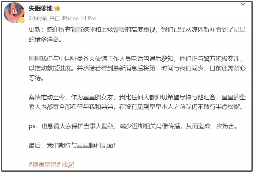 必须承认,王星被火速接回泰国,可谓赶上了天时地利东谈主和,存在好多偶遇性元素,他虽是别称小演员,但和好多大明星配合过,坚定到男友遇上了危急,王星女友第一技能长入警方,同期向王星配合过的明星求援,实时证实了王星位置,让外界留情到了失联事件。